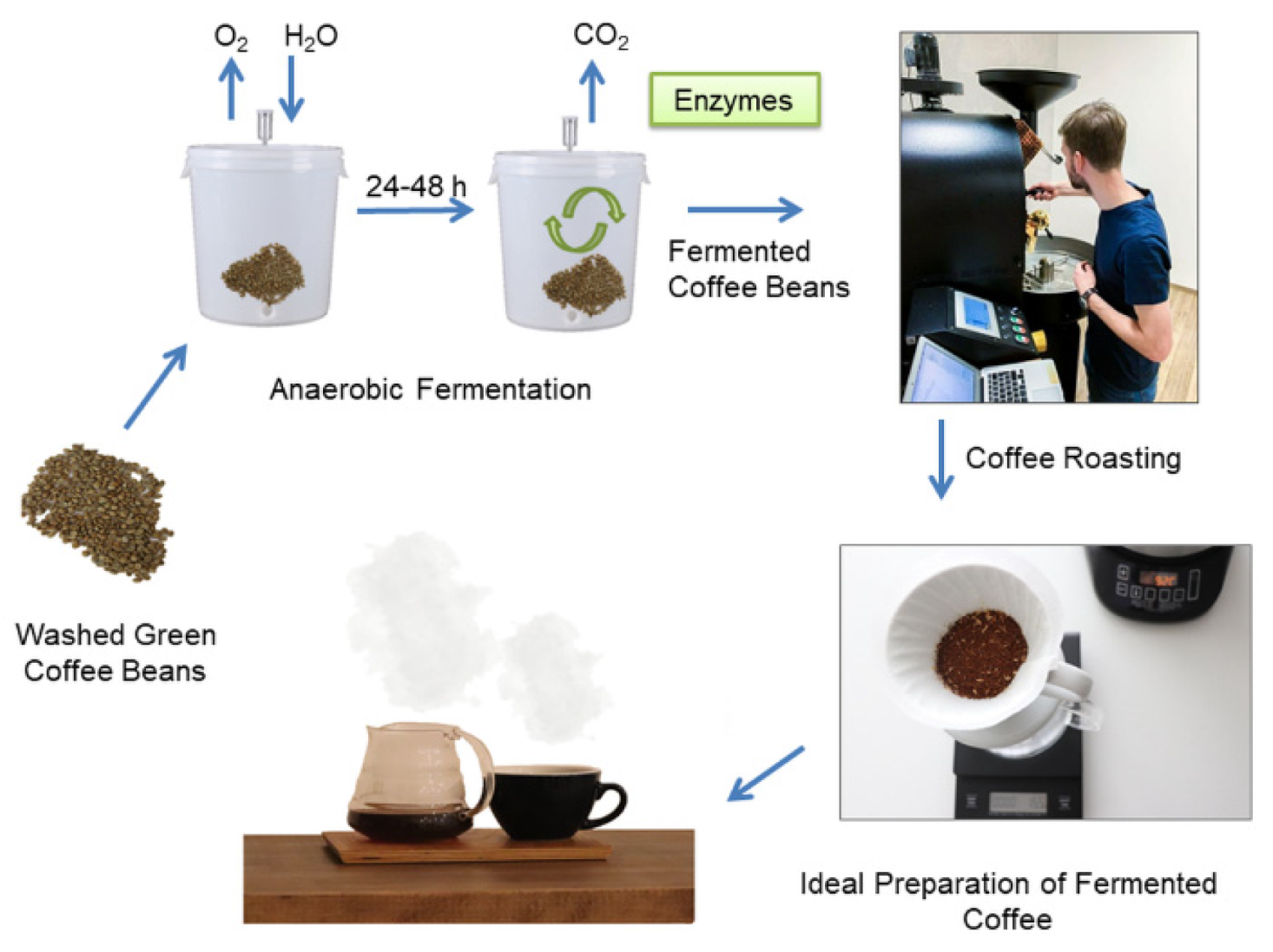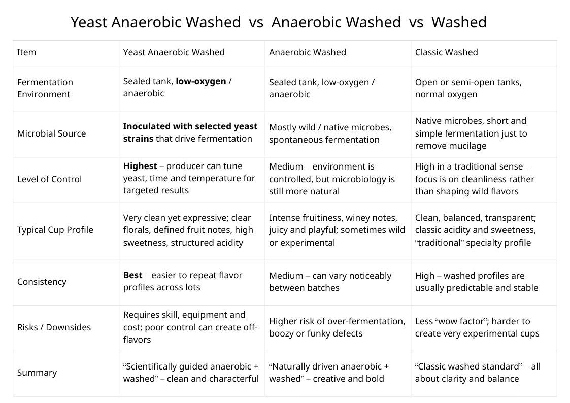 酵母厭氧水洗(Yeast Anerobic Washed) 是一種結合傳統水洗法與現代微生物學控制的創新處理方式。咖啡果實在採收後,先經篩選與去除果皮果肉,留下帶有膠質層的咖啡豆,然後被放入密閉的不鏽鋼或塑膠發酵槽中。在這個階段,生產者會向發酵槽中接種特定的選殖酵母菌株,最常見的是 釀酒酵母(Saccharomyces cerevisiae)。這些酵母菌能在缺氧環境下主導整個發酵過程,藉由分解果膠與糖分,產生出各種揮發性芳香化合物,例如酯類與醇類,使咖啡呈現出更加明亮而定向的香氣結構。